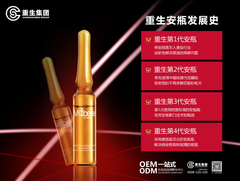 重生集团这一举措,将安瓶从医疗用品变成了护肤神器,也奠定了安瓶的雏形。在行业内引起了巨大的轰动。自此,奠定了重生集团将安瓶作为核心产品,为引领安瓶行业未来打下坚实的基础。